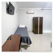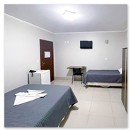 Cama de casal, cama de solteiro, mesa, armário, TV, Wi-Fi, amenidades de banho (sabonete, toalhas, etc.), frigobar, ar-condicionado, telefone